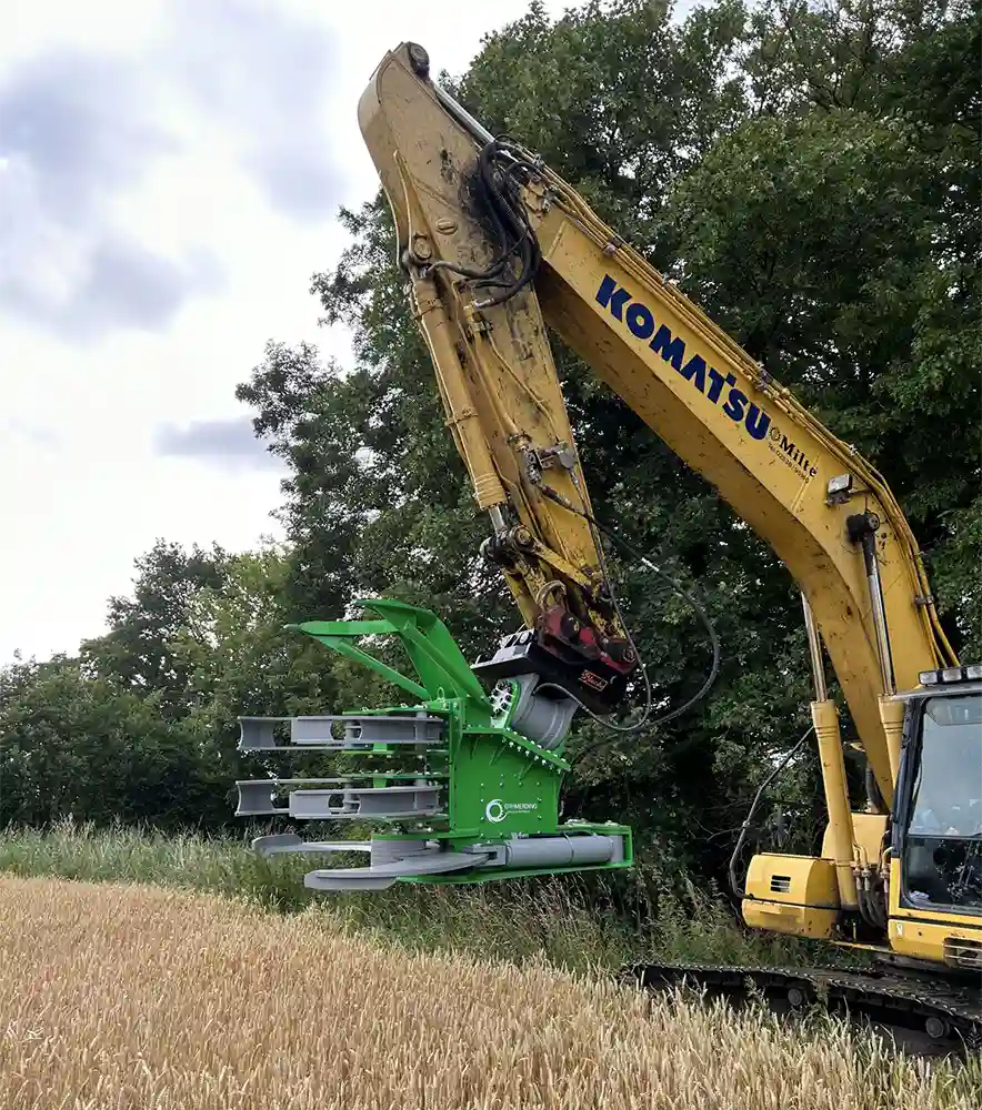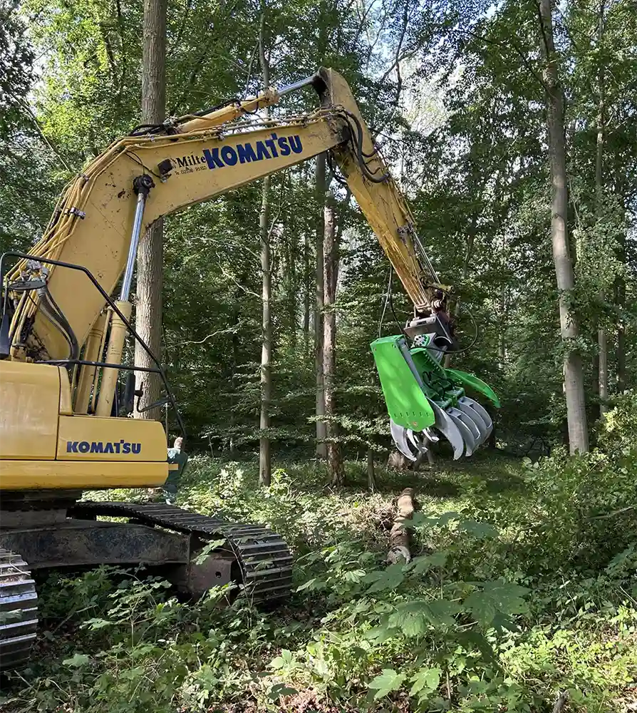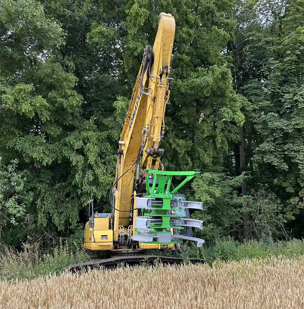 Entwickelt für den Einsatz an Baggern mit einem Dienstgewicht von 18 bis 25 t, bietet die Baumschere TimberTITAN unübertroffene Leistung und Flexibilität. Die beiden gegenläufigen Messer sorgen für einen sauberen Schnitt von Bäumen, Hecken und Sträuchern mit einem Durchmesser von bis zu 50 cm - keine Herausforderung ist zu groß! Ein glattes Schnittbild ist das Markenzeichen der TimberTITAN. Hochwertige Materialien und präzise Konstruktion gewährleisten, dass jeder Schnitt ein Meisterwerk der Baumpflege ist. Ihre Bäume werden nicht nur ästhetisch ansprechend aussehen, sondern auch schneller heilen und gesünder nachwachsen. Mit dieser innovativen Baumschere sparen Sie Zeit und erhöhen die Produktivität Ihrer Baumpflegeprojekte.